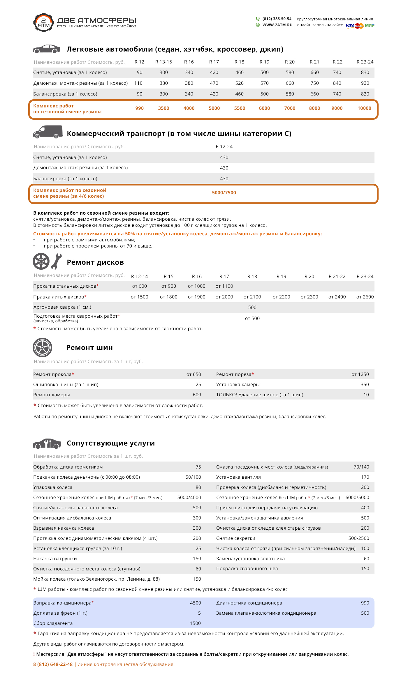 | Комплекс работ по сезонной смене резины | 990 | 3500 | 4000 | 5000 | 5500 | 6000 | 7000 | 8000 | 9000 | 10000 |